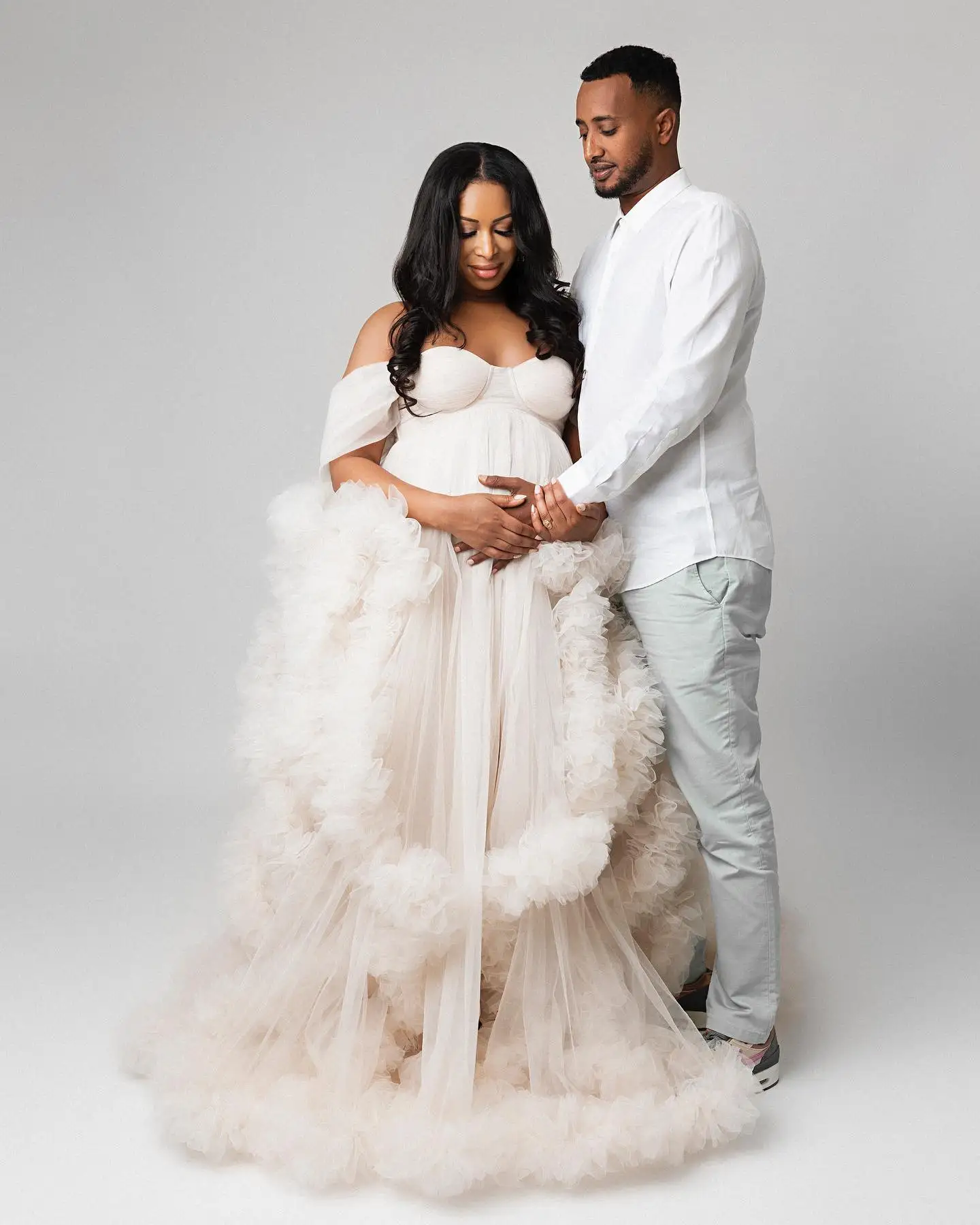 The Aurielle Ivory Tiered Tulle Maternity Photoshoot Gown is designed for the mother who carries grace with composure. Crafted in layered, tiered soft tulle with a structured bodice, this silhouette balances softness with architectural restraint.