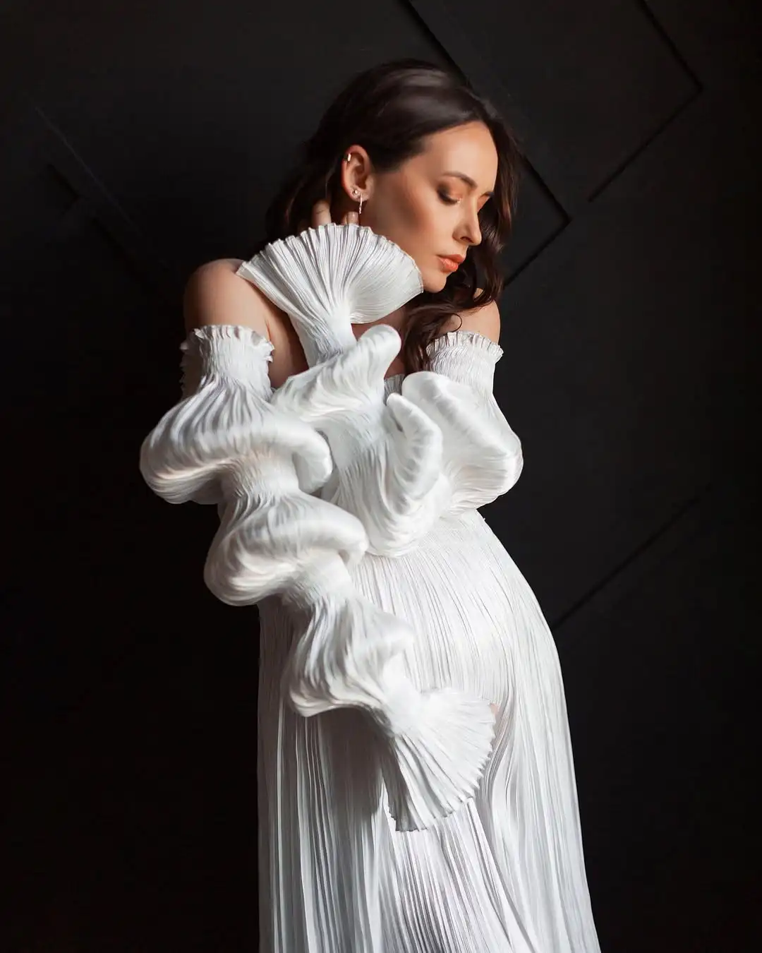 The off-shoulder neckline frames the collarbone with restraint, while sculpted pleated sleeves introduce controlled drama and dimension. The structured pleated bodice contours above the bump with precision, allowing the skirt to release into vertical pleated flow. Unlike volume-driven silhouettes, Aria relies on line, movement, and proportion rather than fullness.