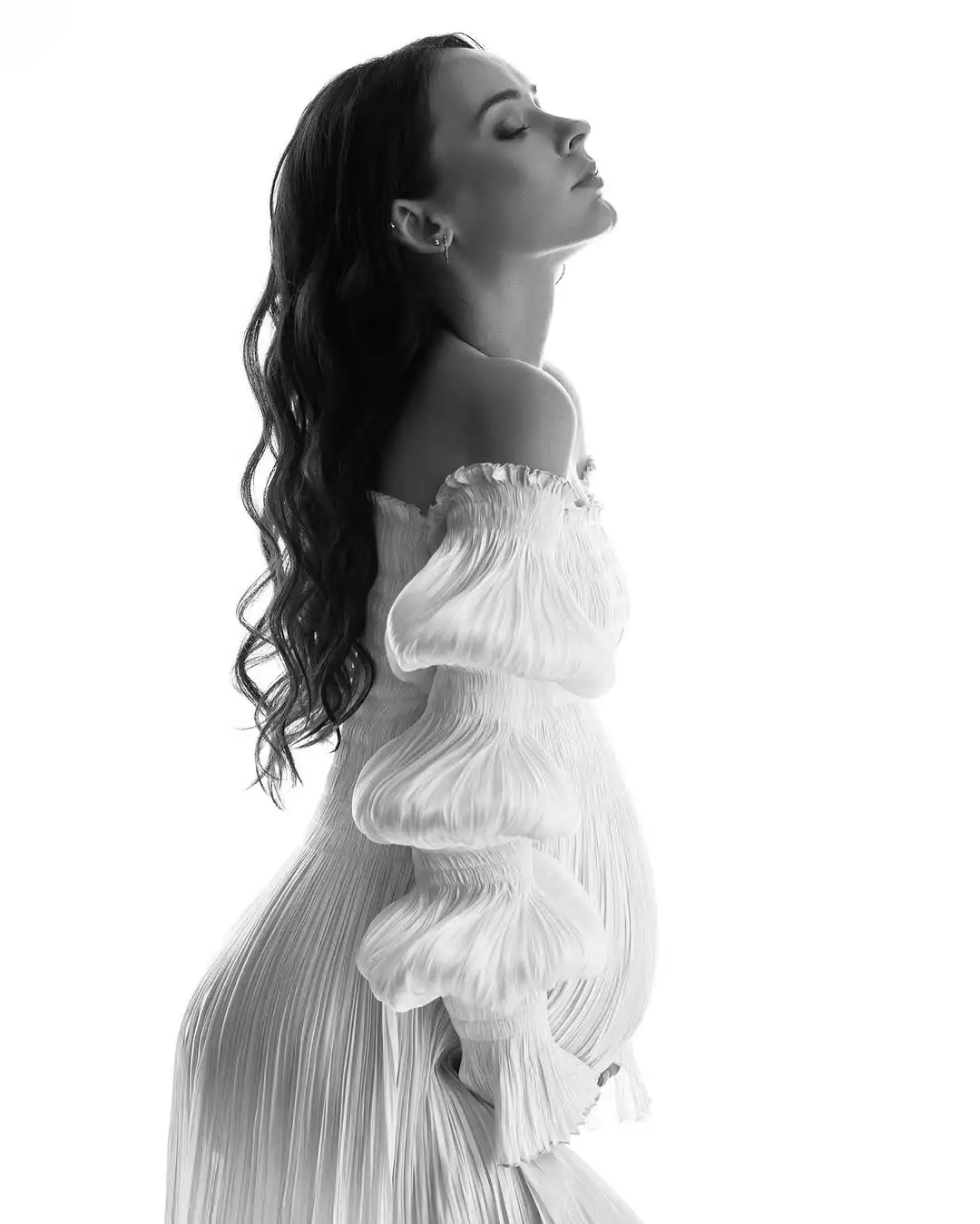 The Aria Sculpted Pleated Maternity Gown is designed for the mother who expresses presence through form rather than excess. Crafted in finely structured pleated chiffon, this silhouette delivers architectural texture while maintaining a clean, elongated line.